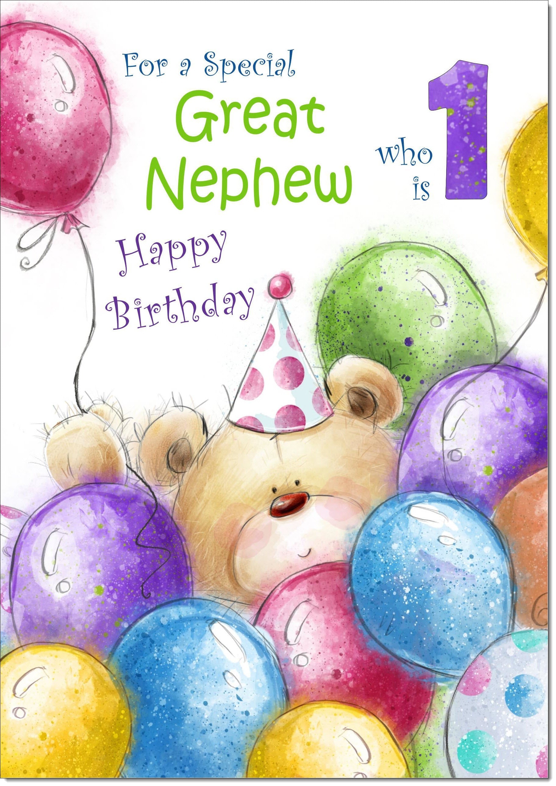 Great Nephew 1st Birthday Card Age 1 Cute Teddy Bear in Balloons
